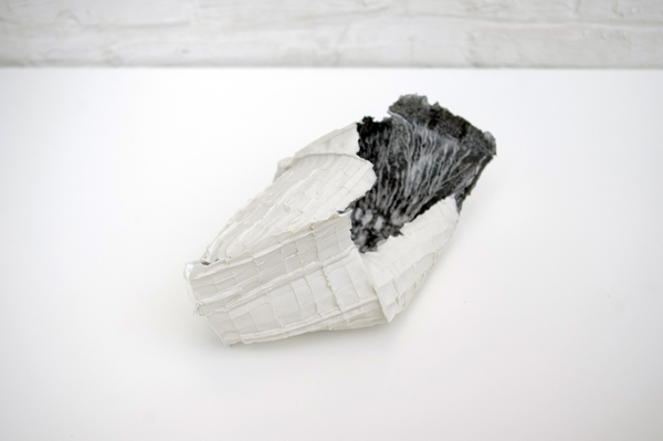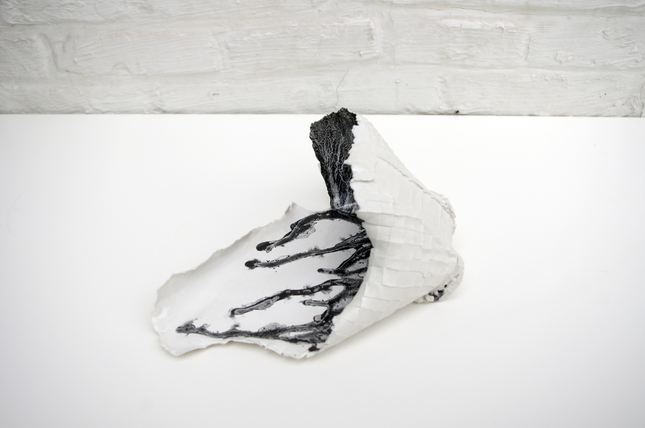 La ville a un flux et reflux qui, tel la mer, abanbonne ses coquilles vides sur ses rivages. Temoins de ce flux, les boites vides abandonnées aux portes des magasins sont comme des coquilles mortes que je récupère, sculpte, puis enduis de porcelaine pour créer des formes nouvelles et organiques.