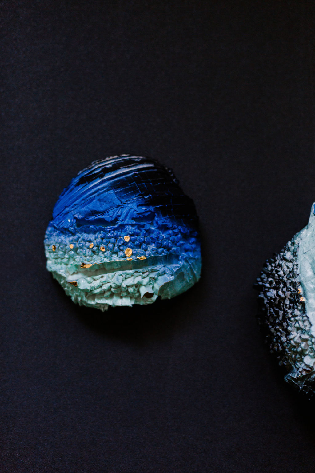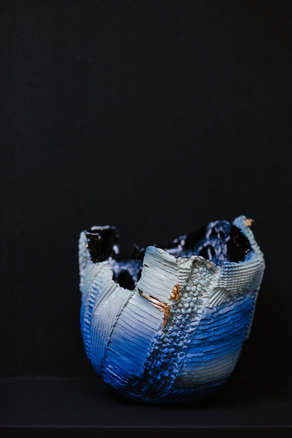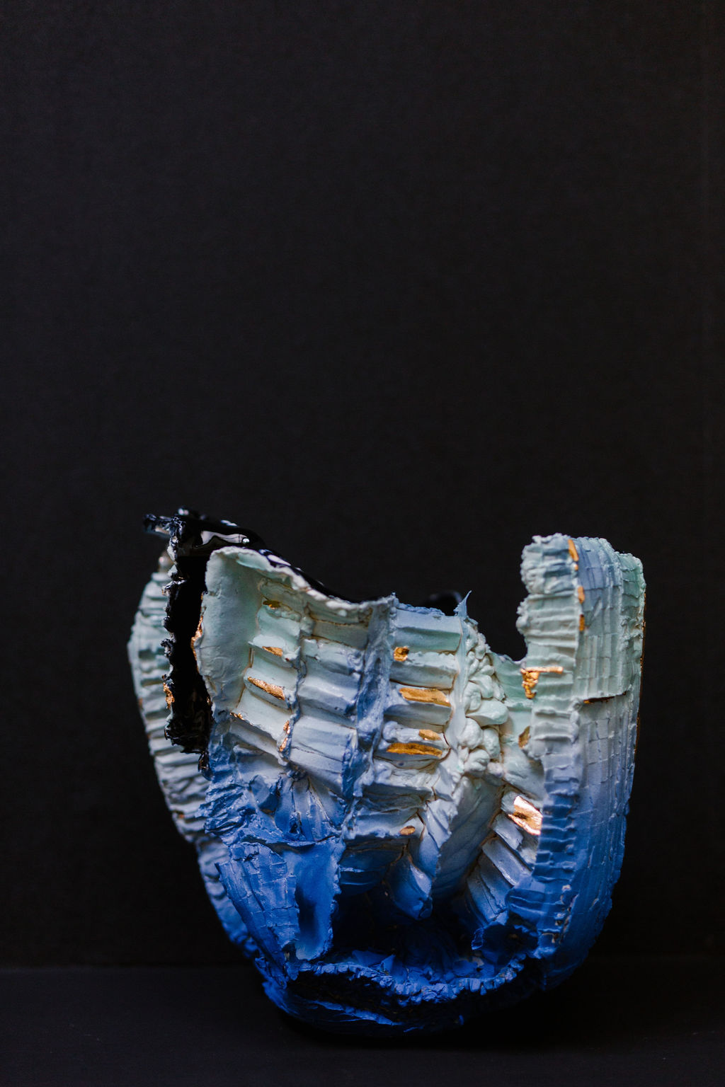 Le projet est tout d’abord né de l’envie de travailler la couleur noire avec la porcelaine. J’ai donc élaboré mes nuances de noir par mélange de la porcelaine et d’oxydes colorants.