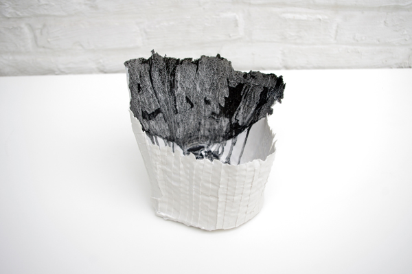 J’utilise donc le café comme une métonymie de notre stress collectif, autrement dit comme le symptôme d’un ‘malaise’ occidental. Je tente à travers ce travail d’appliquer le caractère corrosif du contenu au contenant.